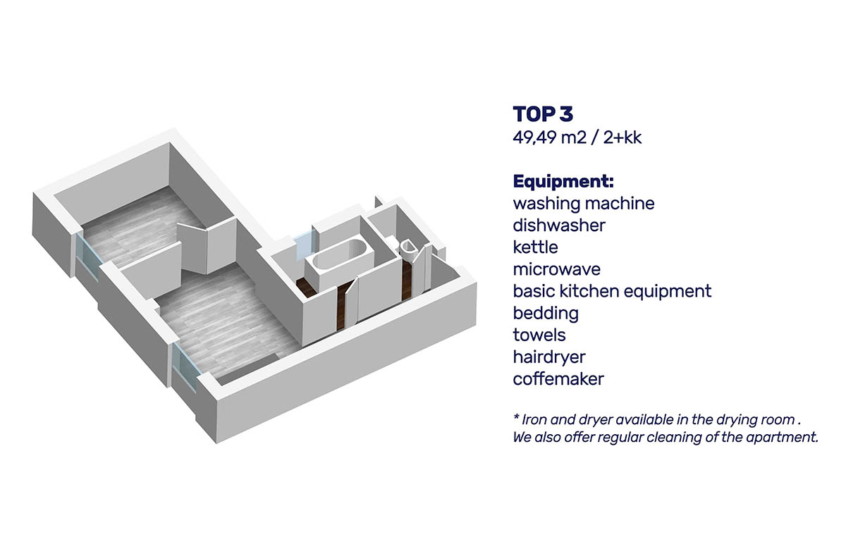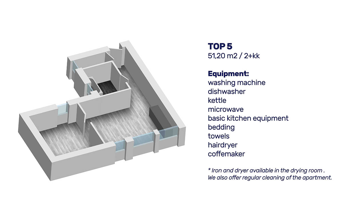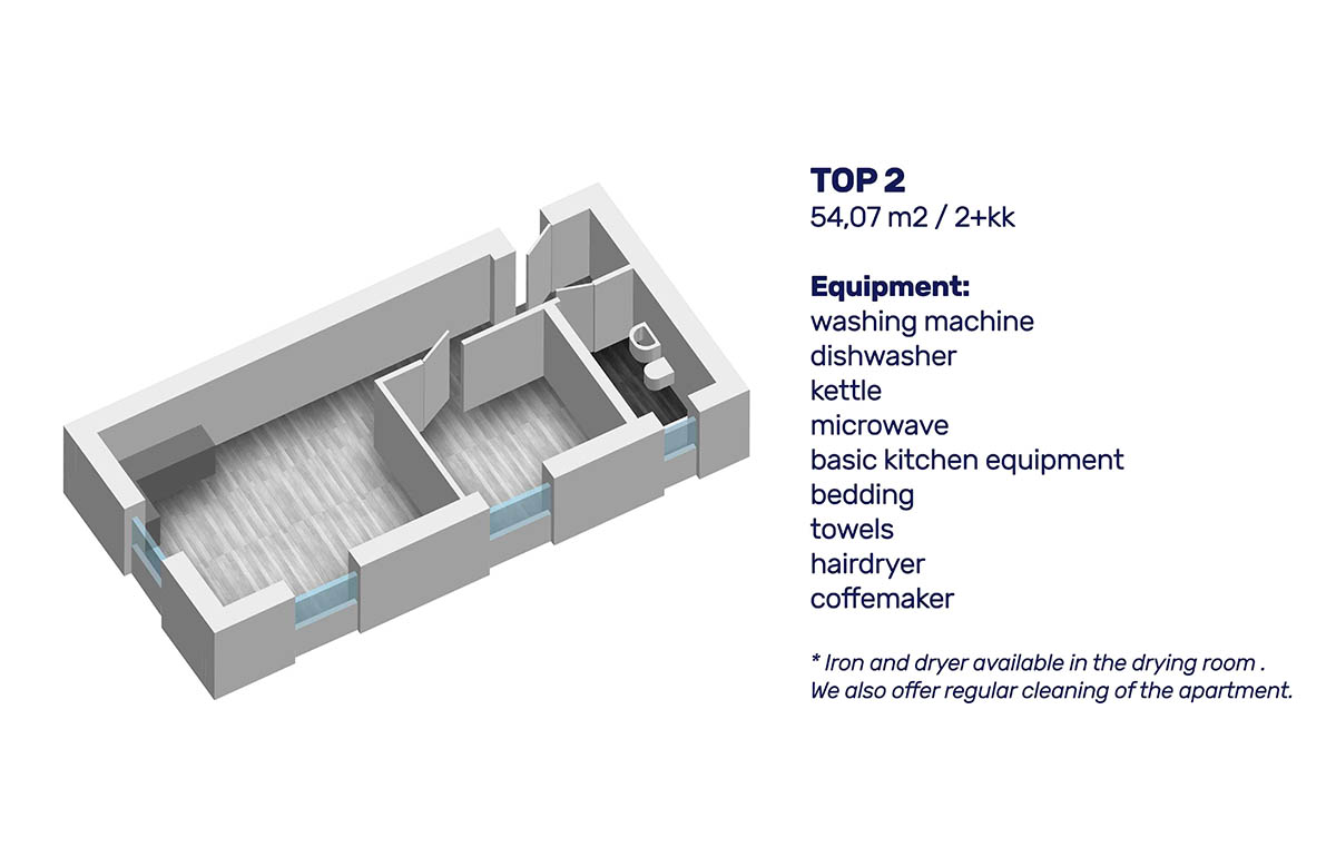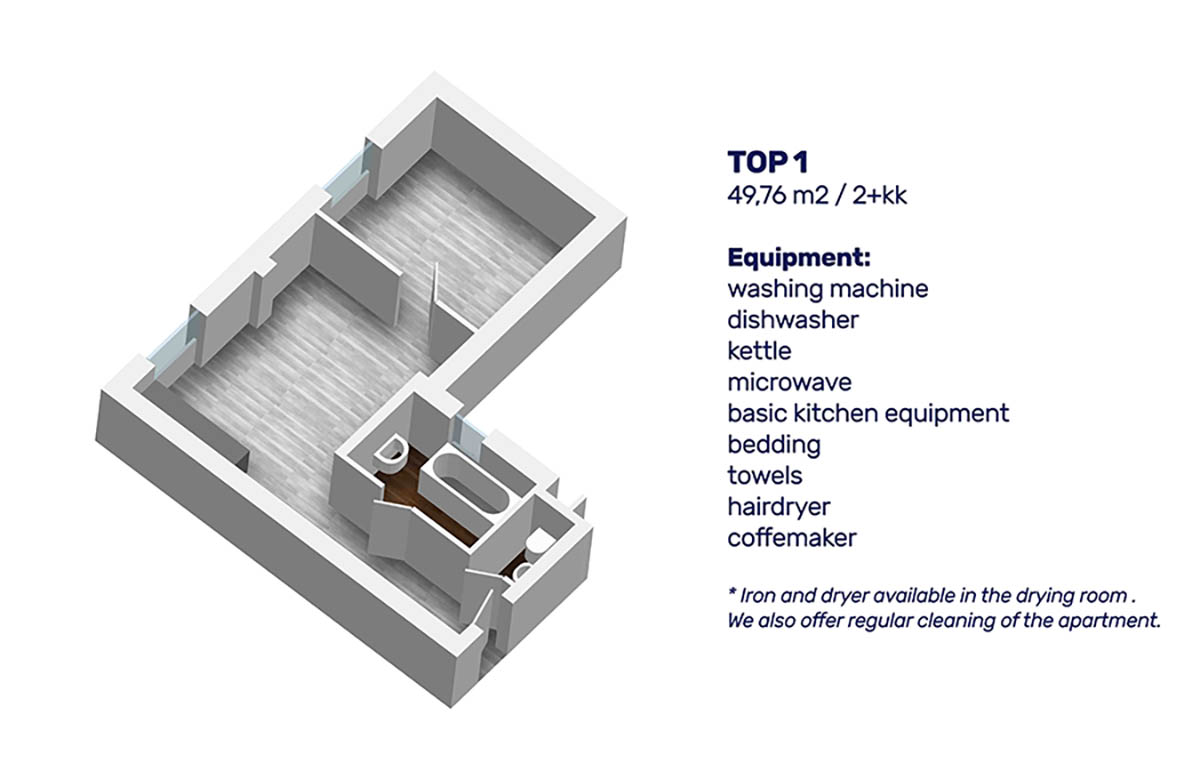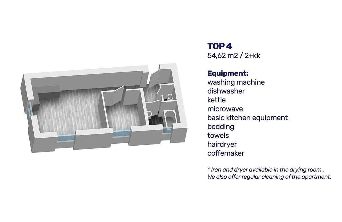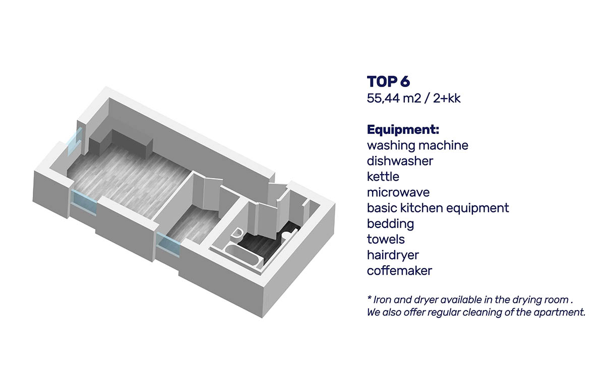 We are offering 6 fully equipped spacious 1-bedroom apartments (2+kk) with a living area of 45 to 55 m² for long-term and short-term rent. The apartments have a fully equipped kitchen with all appliances and utensils, a quiet area with a living room set and a TV, a bedroom with a double bed, a modern bathroom, and plenty of storage space. Each apartment has its own parking space in a fenced area, its own mailbox, and cellar space. We also provide regular cleaning services, including washing and ironing.